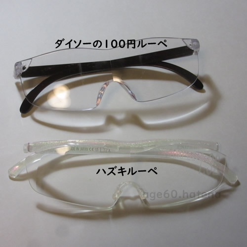 私は遠近両用眼鏡の上からかけているのですが、ダイソーの方がしっかりマッチします。ハズキルーペはかなり前に出さないと眼鏡のフレームをしっかり覆ってくれません。その意味では、かけ心地はダイソーの方が優れています。